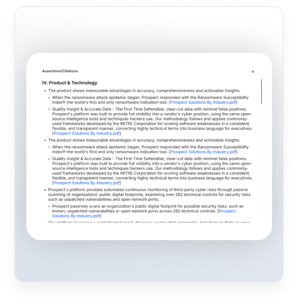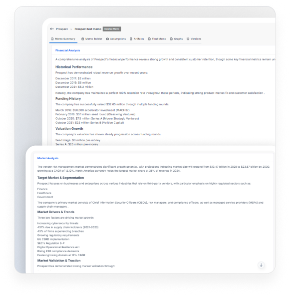 Generate consistent, board-ready reports and memos automatically. With every data point and insight linked to its source, present to your investment committee and board with complete confidence and a fully auditable trail.