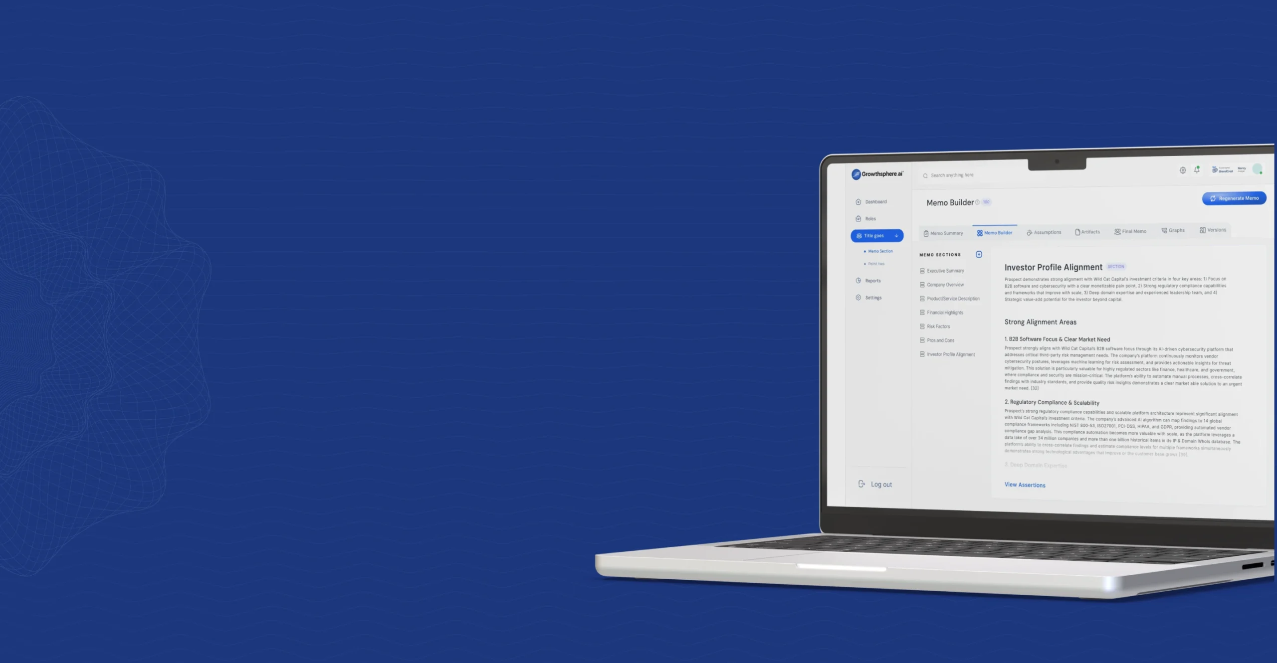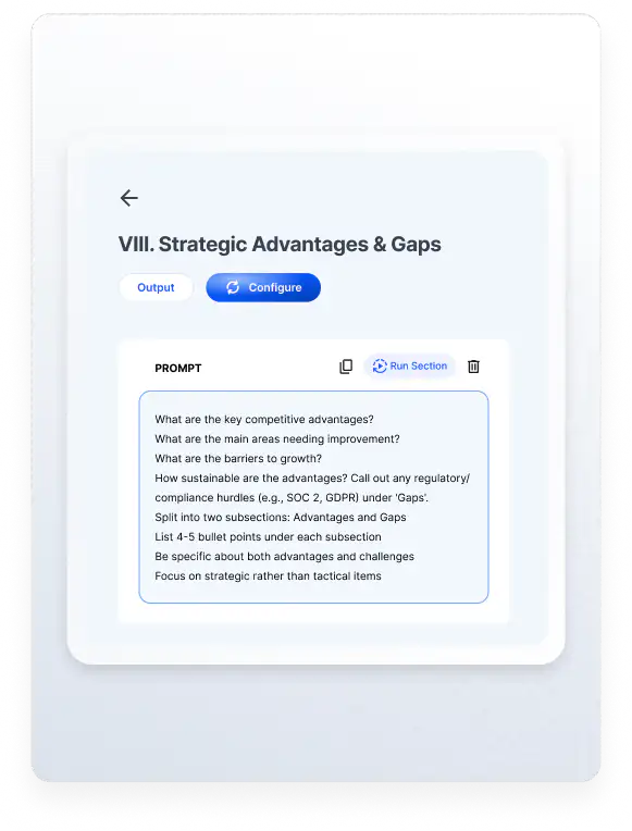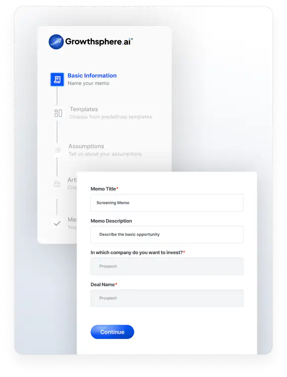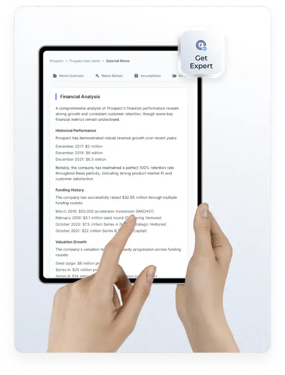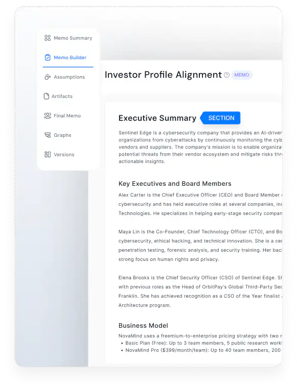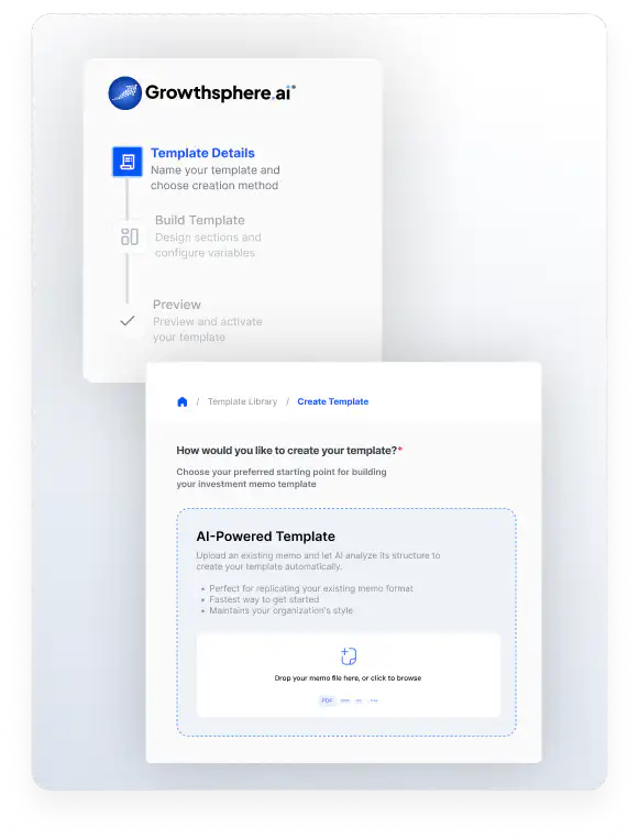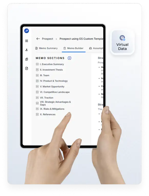 Upload your IC memo once and watch our Template Library auto-generate all the prompts. Memo Builder organizes data room documents, extracts key information, and lets you customize components from our Library.