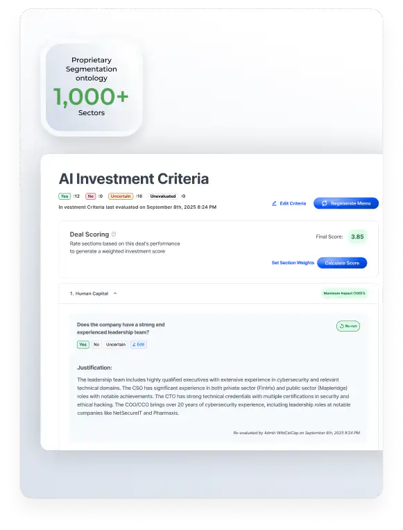 Set up your Investor Profile, Investment Criteria Checklist, and Template Library. Evaluate deals against your fund’s actual investment criteria using our personalized reasoning models along with weighted scoring to stack-rank your pipeline.